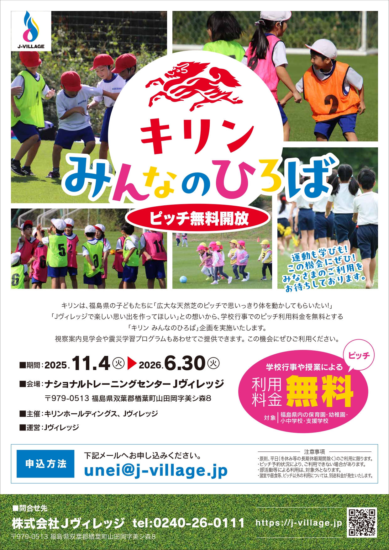 福島県内の幼稚園、保育園、小中学校、特別支援学校を対象とし、遠足などの校外学習時に天然芝ピッチなどを無料でご提供します。
